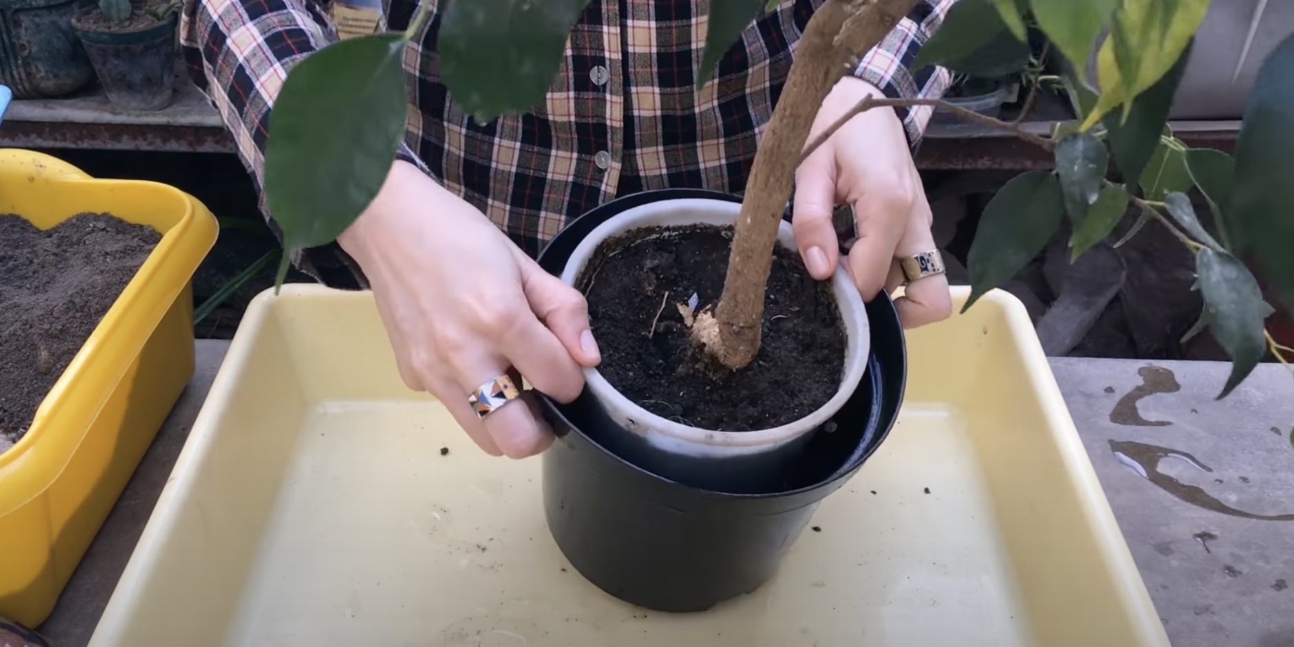 - Высадите фикусы в новый горшок, досыпьте грунт и уплотните его.
