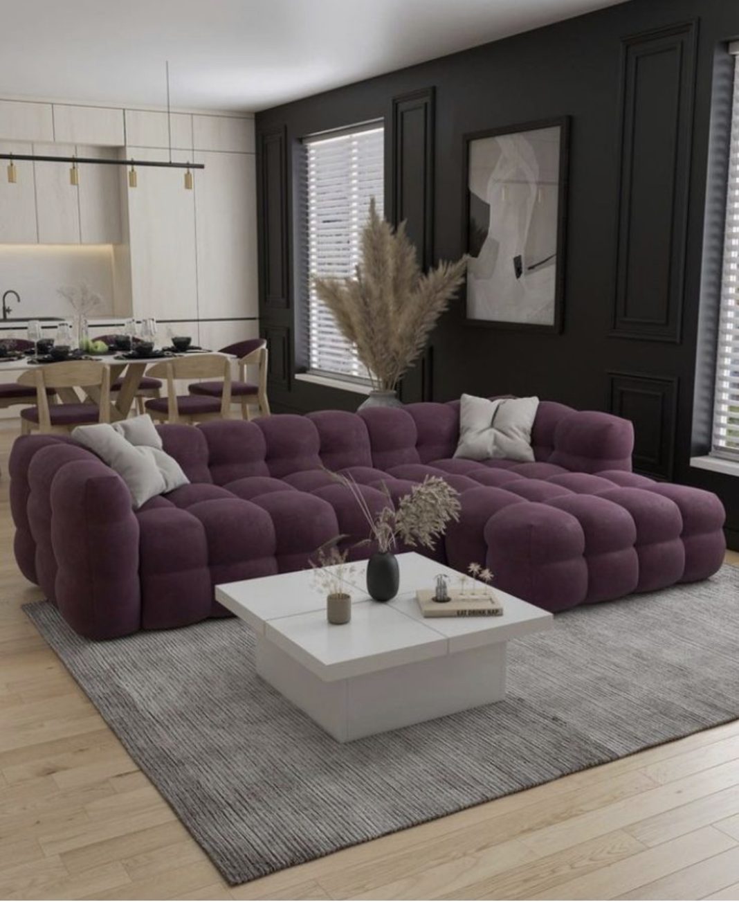 - Нейтральный фон. Чтобы фиолетовый диван стал главным героем, окружите его холодными нейтральными тонами. Стены, пол или крупная мебель в черных, белых или серых оттенках создадут идеальный лаконичный фон, который подчеркнет красоту дивана, не перегружая пространство.