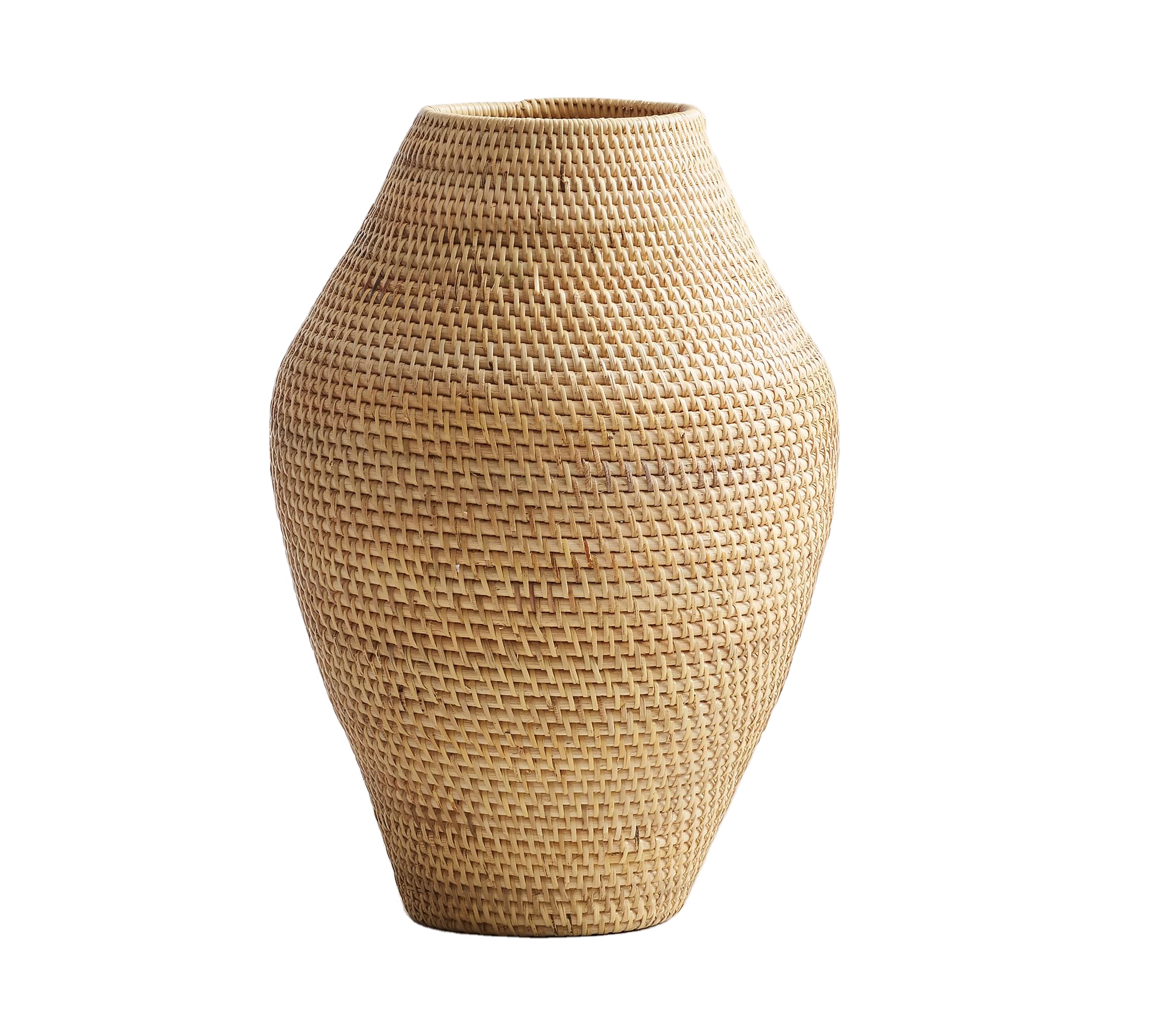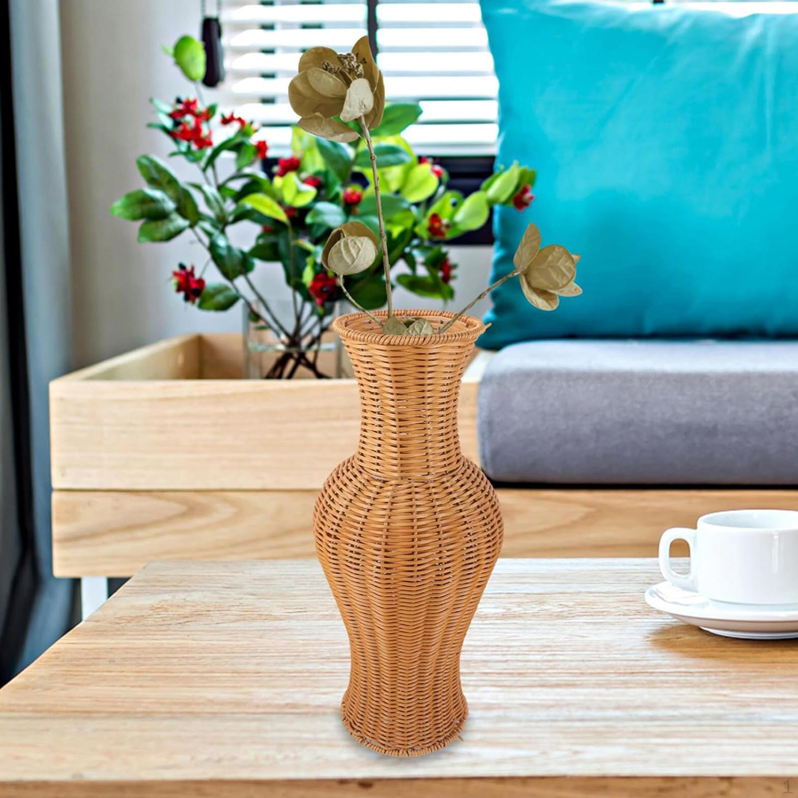 Для интерьеров в эко- или бохо-стиле, стремящихся к близости с природой, идеальным выбором станет ваза из ротанга. В отличие от каменных, они могут быть разных размеров: от напольных до небольших настольных вариантов для журнального столика.