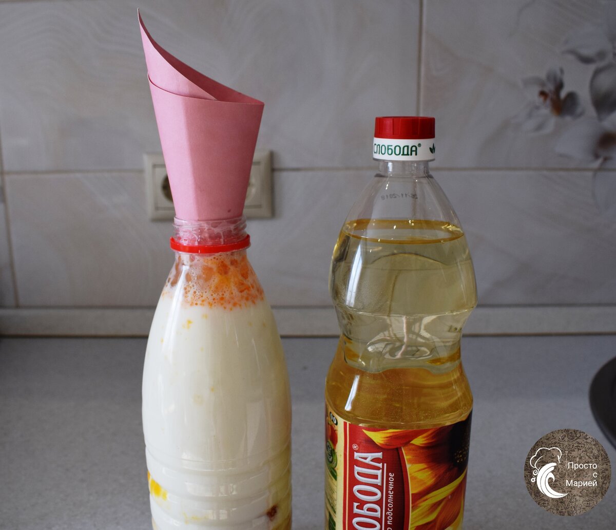 Теперь самое интересное. Возьмите чистую сухую пластиковую бутылку (например, из-под воды) и с помощью кухонной воронки сначала засыпьте в нее все сухие ингредиенты (муку, соль, сахар), а затем добавьте жидкие: взбитые вилкой яйца, молоко и масло.