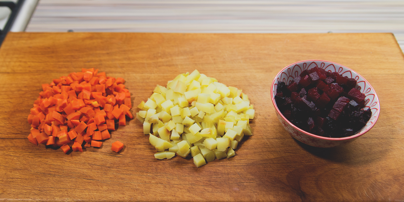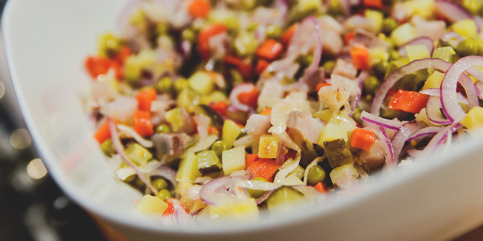 Дальше всё идёт по классическому рецепту винегрета, но на основе новых, более вкусных ингредиентов. Изобретать ничего не нужно, просто следуйте привычной схеме.