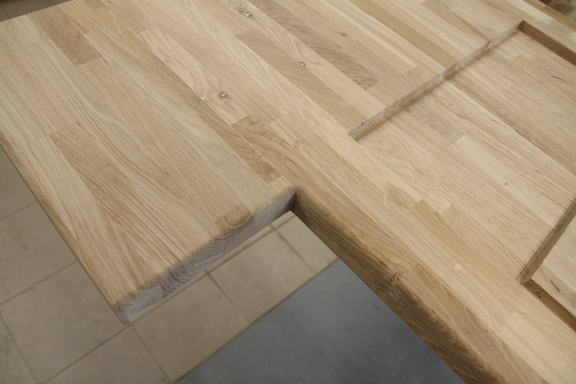 Завершающим этапом изготовления стала финальная обработка кромок ручным фрезером и тонкая доводка поверхности наждачной бумагой «нулёвкой». Для подчёркивания природной текстуры дуба был нанесён слой морилки. После этого столешница, готовая к покрытию лаком и последующему монтажу на кухне, обрела свой законченный вид.