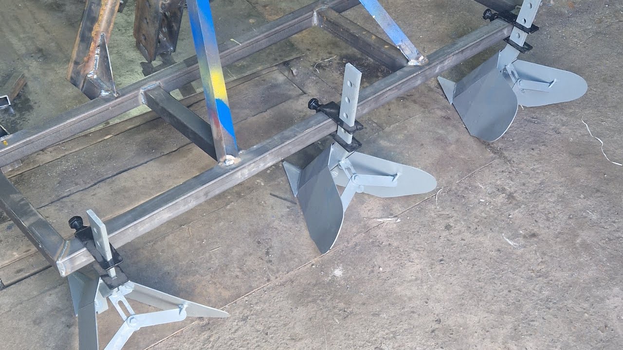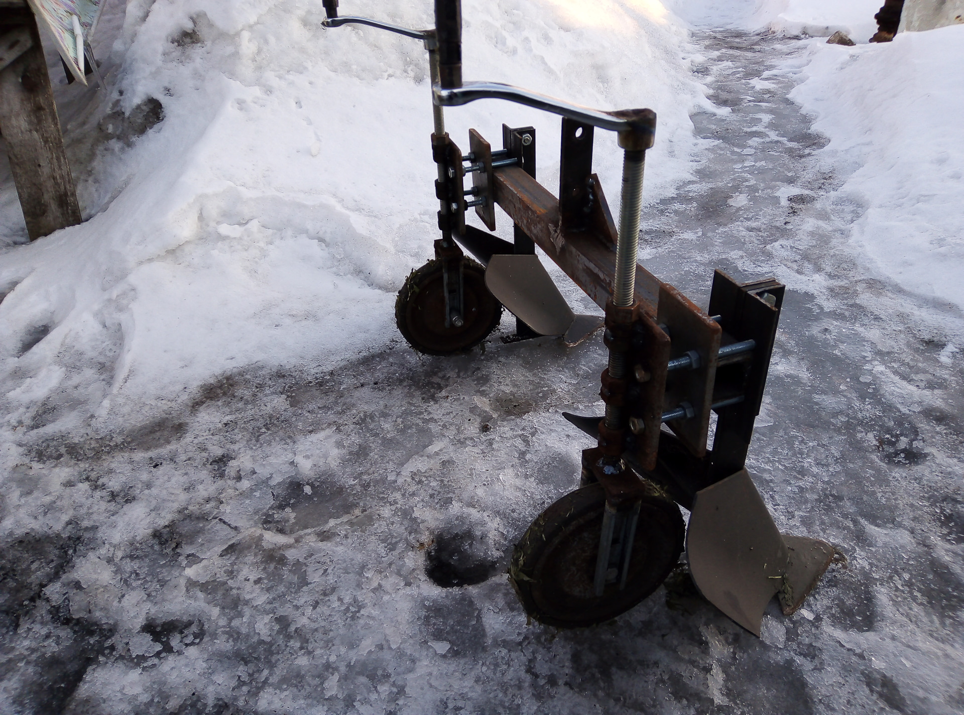 - Сборка рамы. Из стальных труб сваривается П-образная или Т-образная рама. К ее передней части крепятся (с возможностью регулировки по ширине) кронштейны с осями для дисков. К задней части привариваются рукояти для управления.