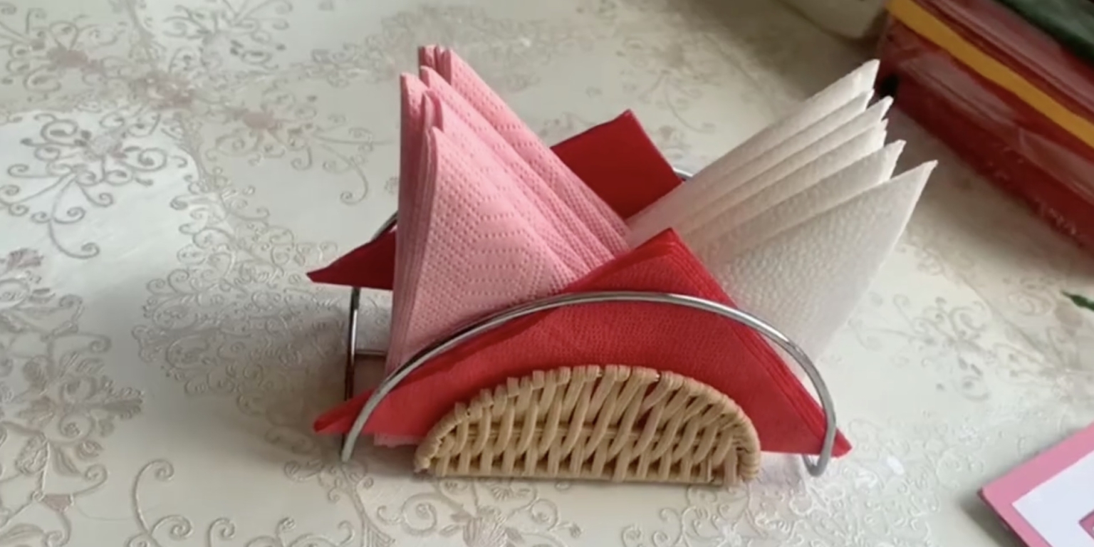 Это один из самых простых и быстрых способов укладки салфеток в салфетницу. Для большего эффекта можно комбинировать салфетки двух контрастных цветов.