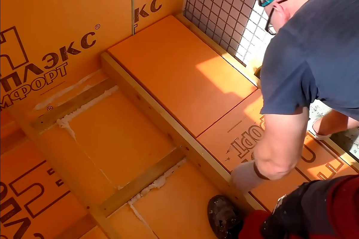 - Укладка пеноплекса. Плиты размещаются между лагами или поверх чернового пола. Все зазоры и щели заполняются монтажной пеной (без толуола).