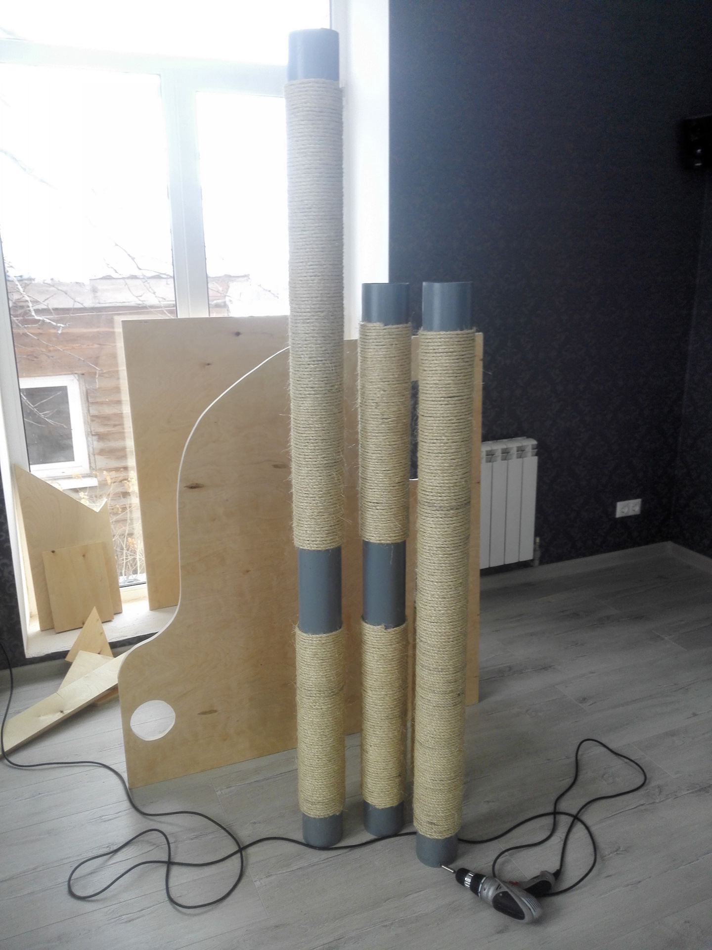 Сборка была достаточно простой. Все деревянные детали я вырезал с помощью электролобзика. Самый ответственный этап – обмотка центрального столба джутовым канатом. Наматывать его нужно очень плотно, виток к витку, чтобы в будущем он не сползал и не разматывался. Для надёжности я дополнительно фиксировал канат строительными скобами. Ковролином я обил все остальные поверхности (основание, наклонную доску и верхнюю площадку), также закрепив его скобами.